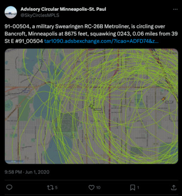 My twitter bots, known as the Advisory Circular network, provided real-time updates (until they were banned by Twitter) whenever they detected aircraft flying in circles over cities around the world, including Los Angeles, Baltimore, Portland, Minneapolis, and London. The bots increased public awareness of news and fire aircraft, police, FBI, DHS, DEA, CBP, and military aircraft. The key insight was that an aircraft flies in a circle because it's doing something instead of going somewhere.